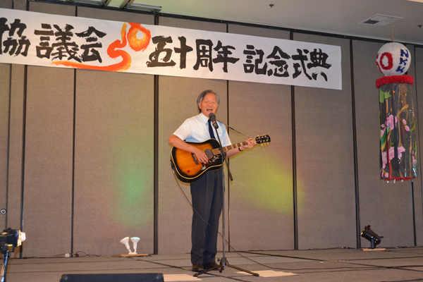 南加県人会協議会五十周年記念式の席上、会場の四百五十人も一緒に歌って見る見る日系社会が一つになりました。