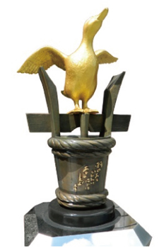 本来飛べないアヒルに「羽のある言い訳程はあひるとぶ」という句を示したのが『誹風柳多留』の編者・呉陵軒可有で、祖の句とともに記念碑となった金のアヒルは、文芸としての川柳の出発点の象徴です。
