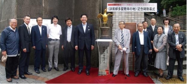 『誹風柳多留』発祥の地の記念碑除幕式の様子=平成27年(2015年)