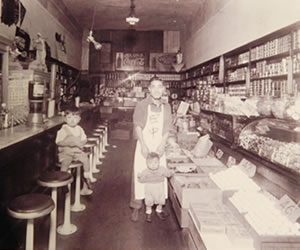 シシマさんの両親が経営していた「Mercado Plaza」。手前の子供がシシマさん、左はお兄さんサンタアニータ競馬場のアセンブリー・センターでは、駐車場に建てられたバラックで暮らしたから、馬の匂いがしなくてラッキーだったよ。競馬場では、戦場で使うカモフラージュネットを軍が作ってた。それと同じ場所で、僕たちは授業をしたんだ。