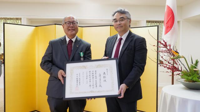 式典は、家族や友人、関係者が出席する中で行われ、室田総領事は祝意を述べるとともに、表彰状および緑白綬有功章を山崎氏に授与した。