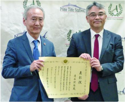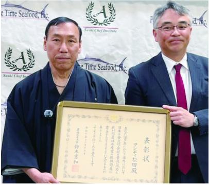 在ロサンゼルス日本国総領事館は3月12日、トーランスの寿司料理学校「Sushi Chef Institute」において、「日本食海外普及功労者」表彰状授与式を開催し、受賞者のアンディ松田氏と清水照雄氏の功績を称えた。